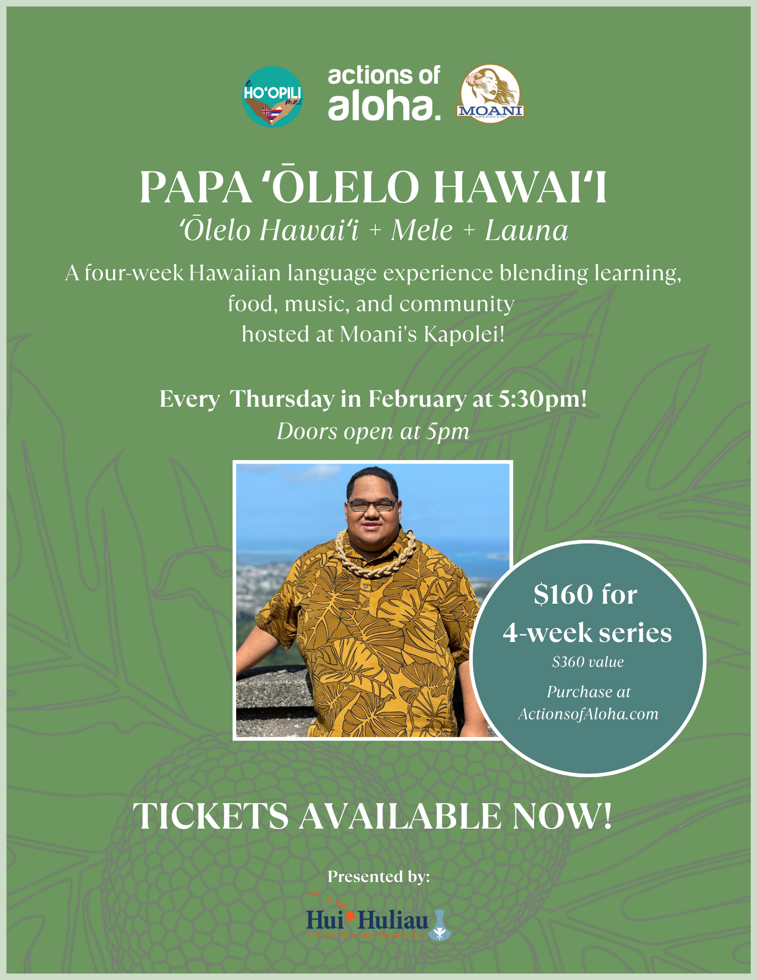 This ticket grants admission to Papa ʻŌlelo Hawaiʻi, a four-week Hawaiian language experience presented by Actions of Aloha and E Hoʻopili Mai.